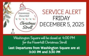 Washington Square will be closed for the Haverhill Christmas Stroll. Beginning at 4:00 PM, all MeVa Haverhill based routes will serve the downtown area from Bailey Boulevard, following our standard detour pattern for this event. The last buses departing Washington Square will be at 3:00 PM and 3:30 PM, accordingly.